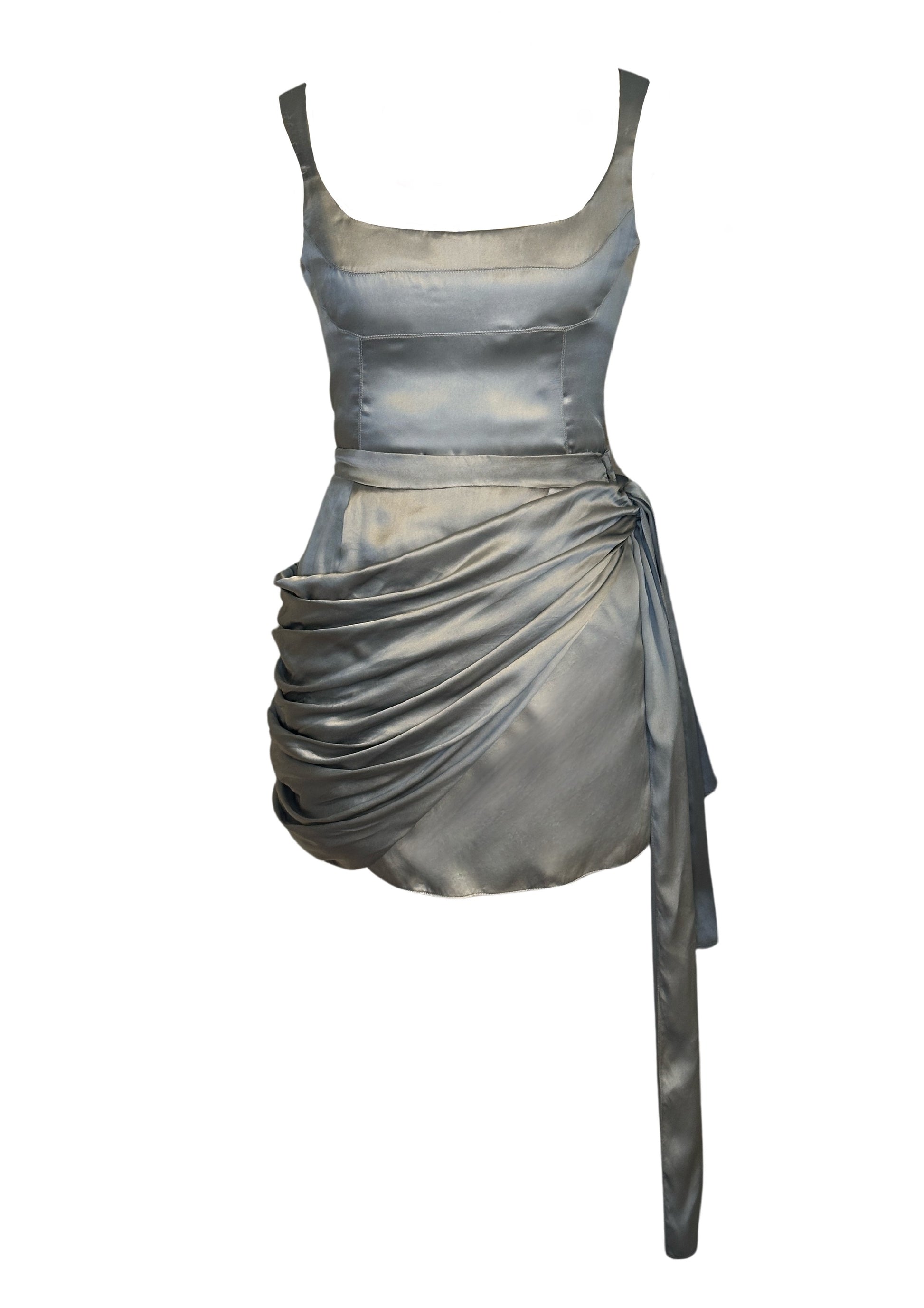 L'ensemble Athènes se caractérise un top de style débardeur présente une couture arrondie au niveau de la poitrine, assurant un léger maintien et convenant à différentes morphologies.La jupe courte de cet ensemble développe un léger volume au niveau des hanches grâce à son drapé noué latéralement, tandis que les pans flottants accompagnent délicatement le mouvement de la jambe, créant un effet aérien lors de la marche.