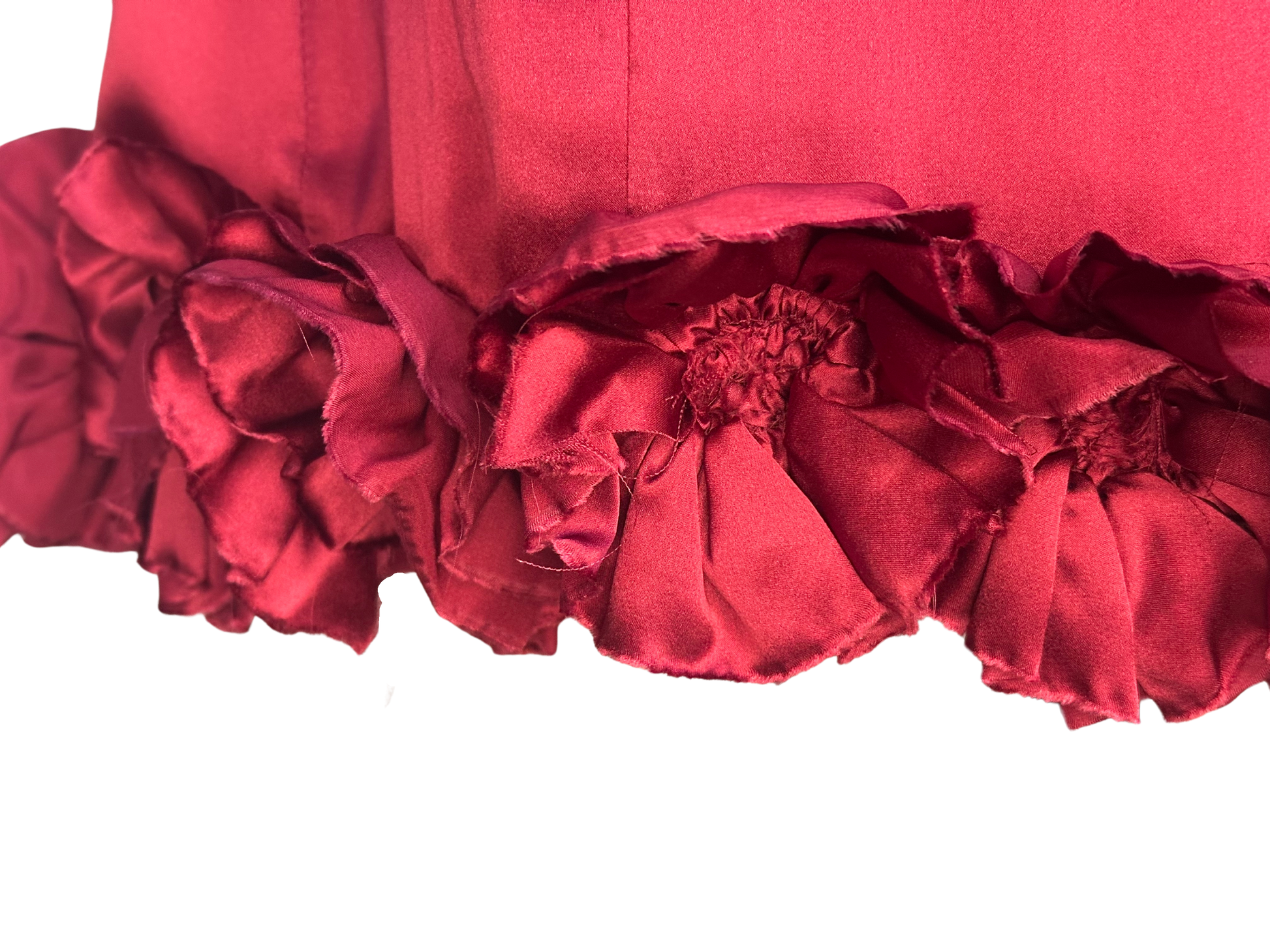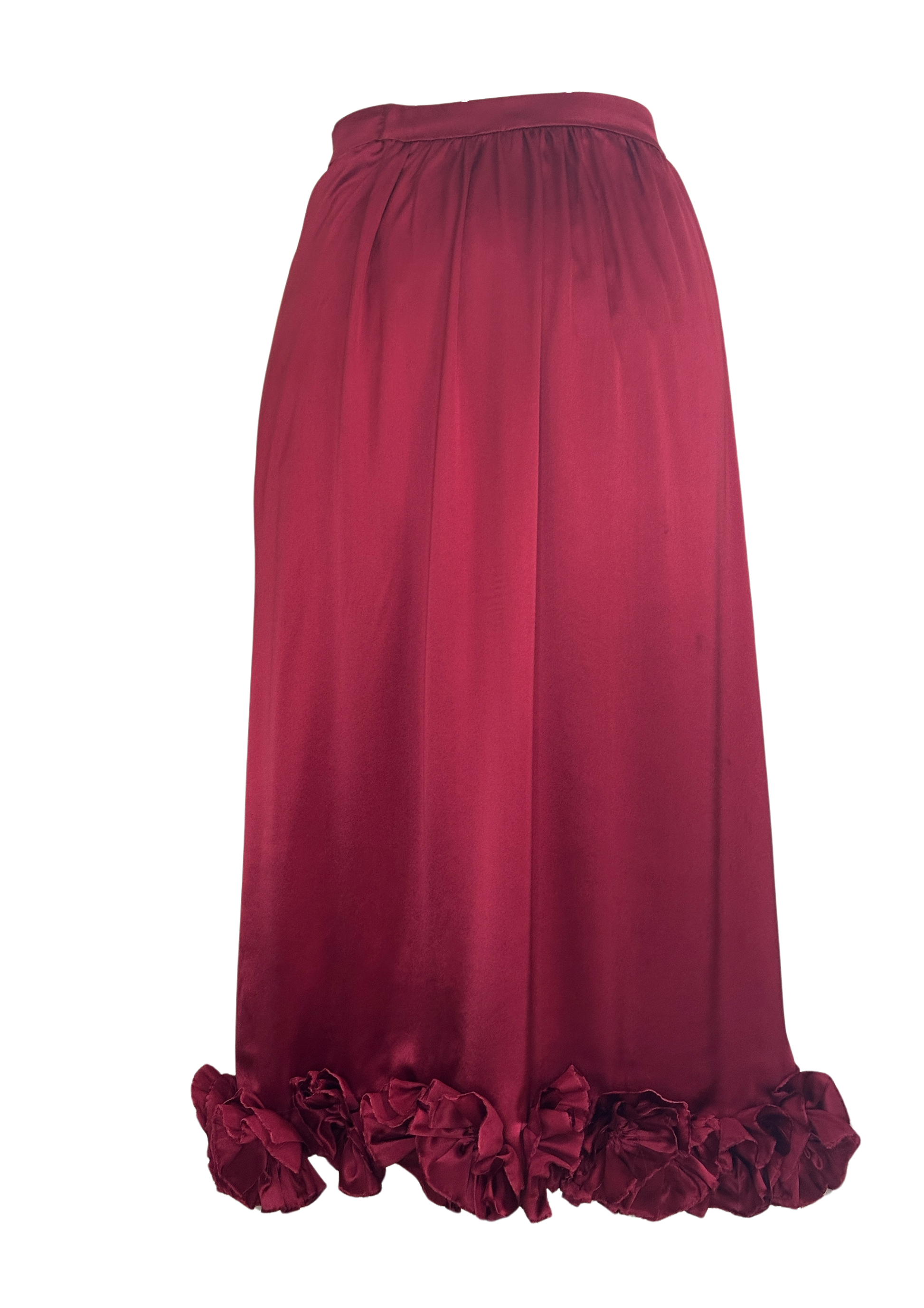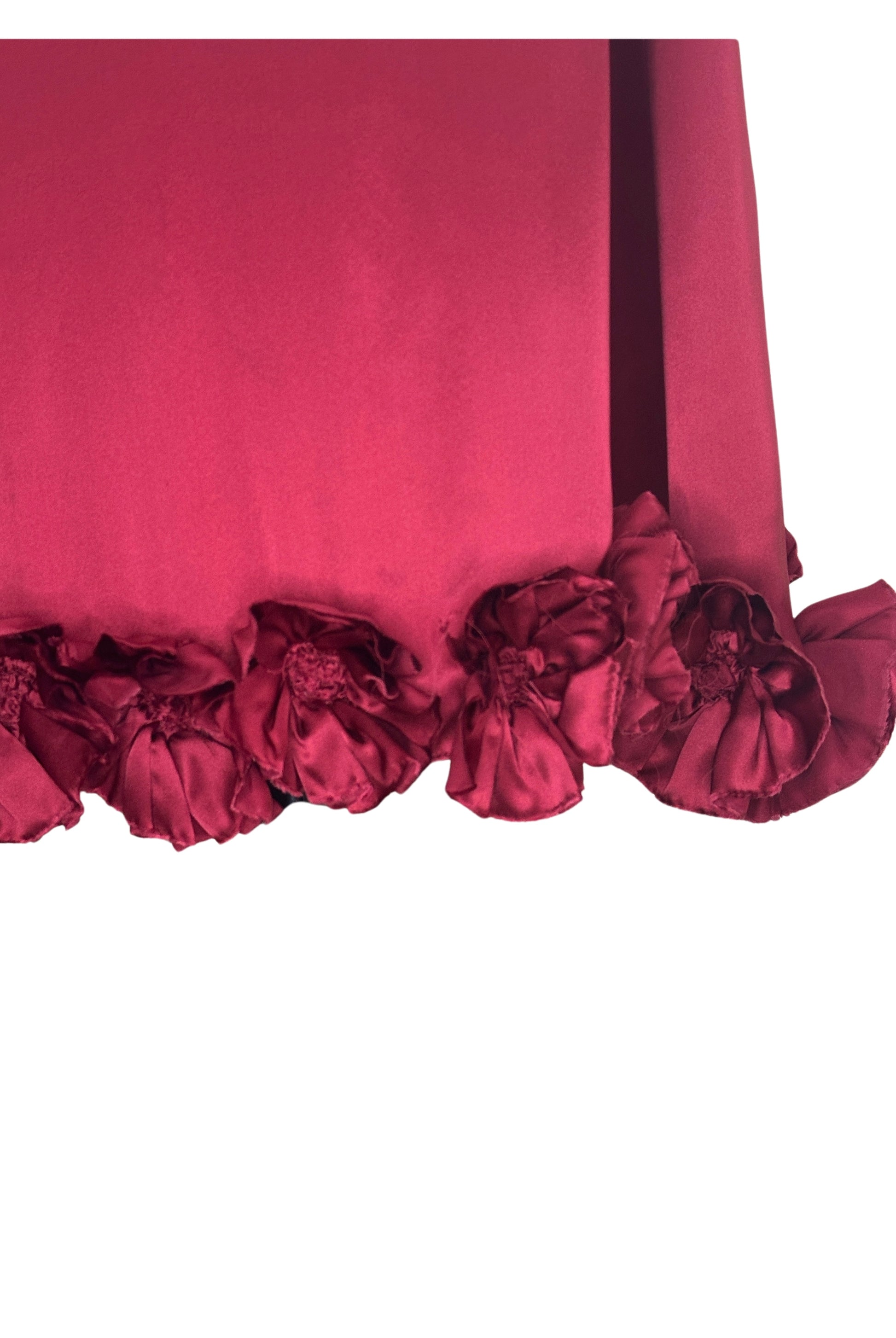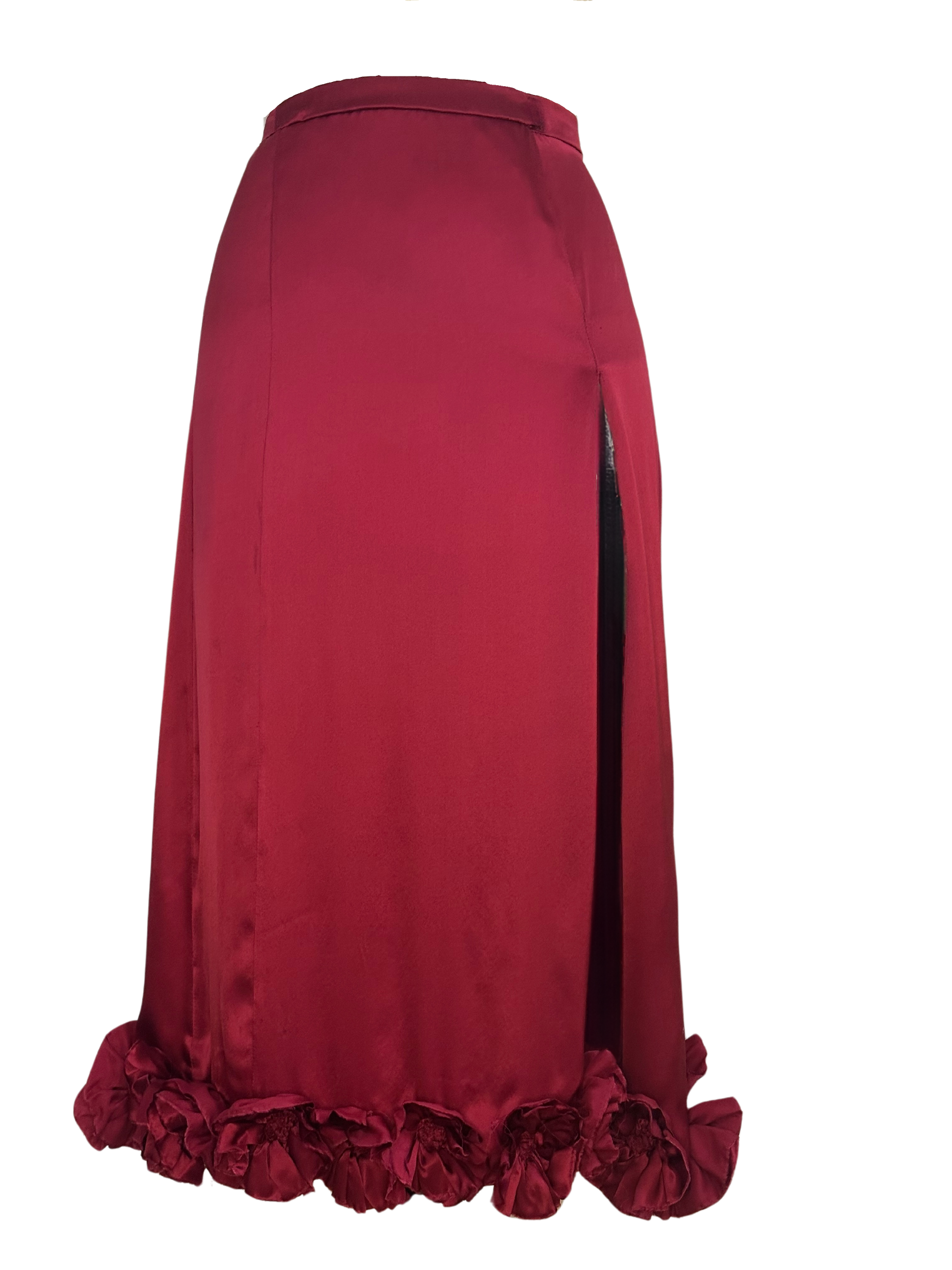 La jupe portefeuille se ferme élégamment à l’avant grâce à une pression subtile. Elle dévoile une fente au niveau de la cuisse pour souligner une allure sophistiquée et séduisante. Le bas de la jupe est orné de fleurs aux bords effilochés, ajoutant une touche unique et raffinée. (faites à la main)