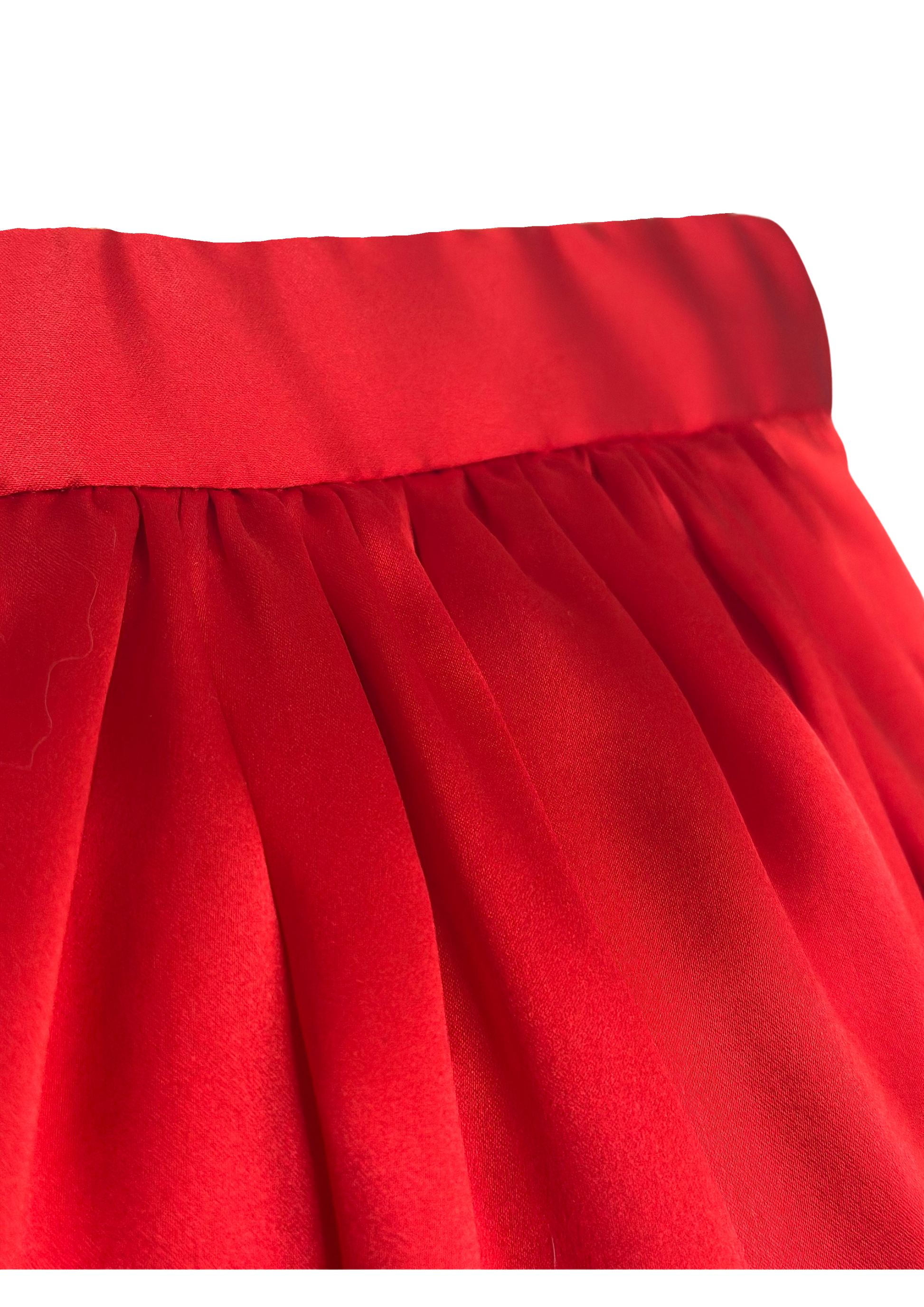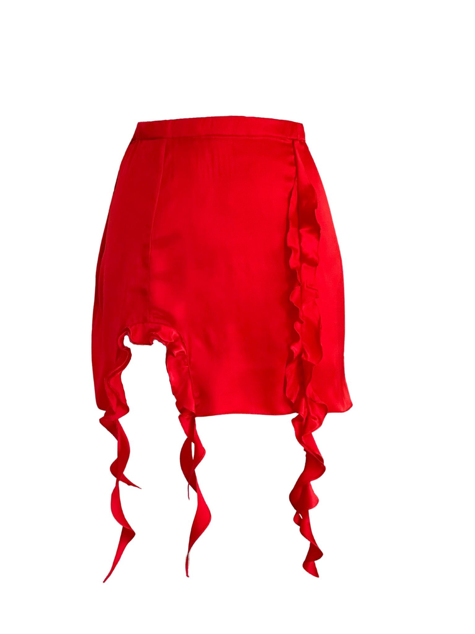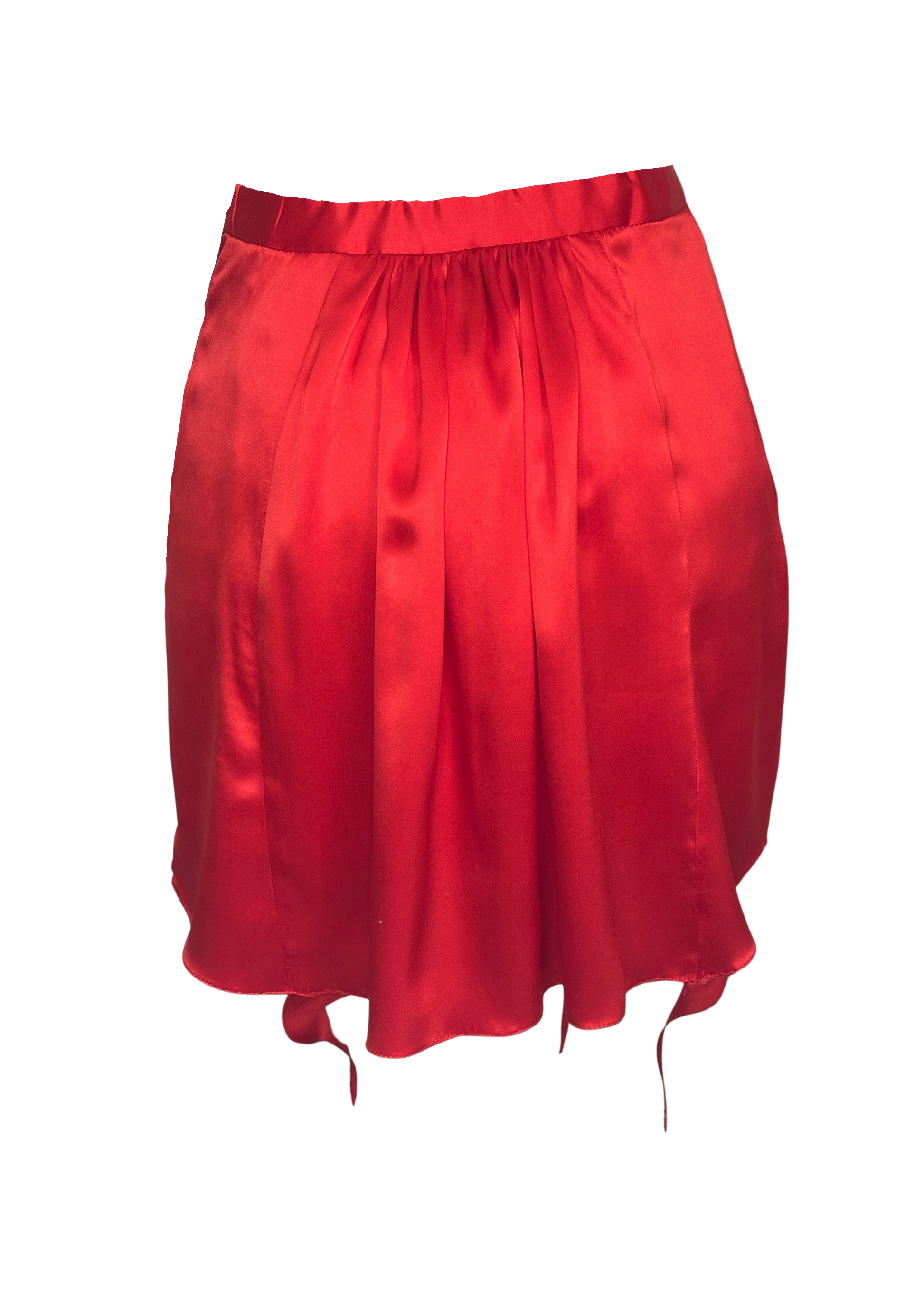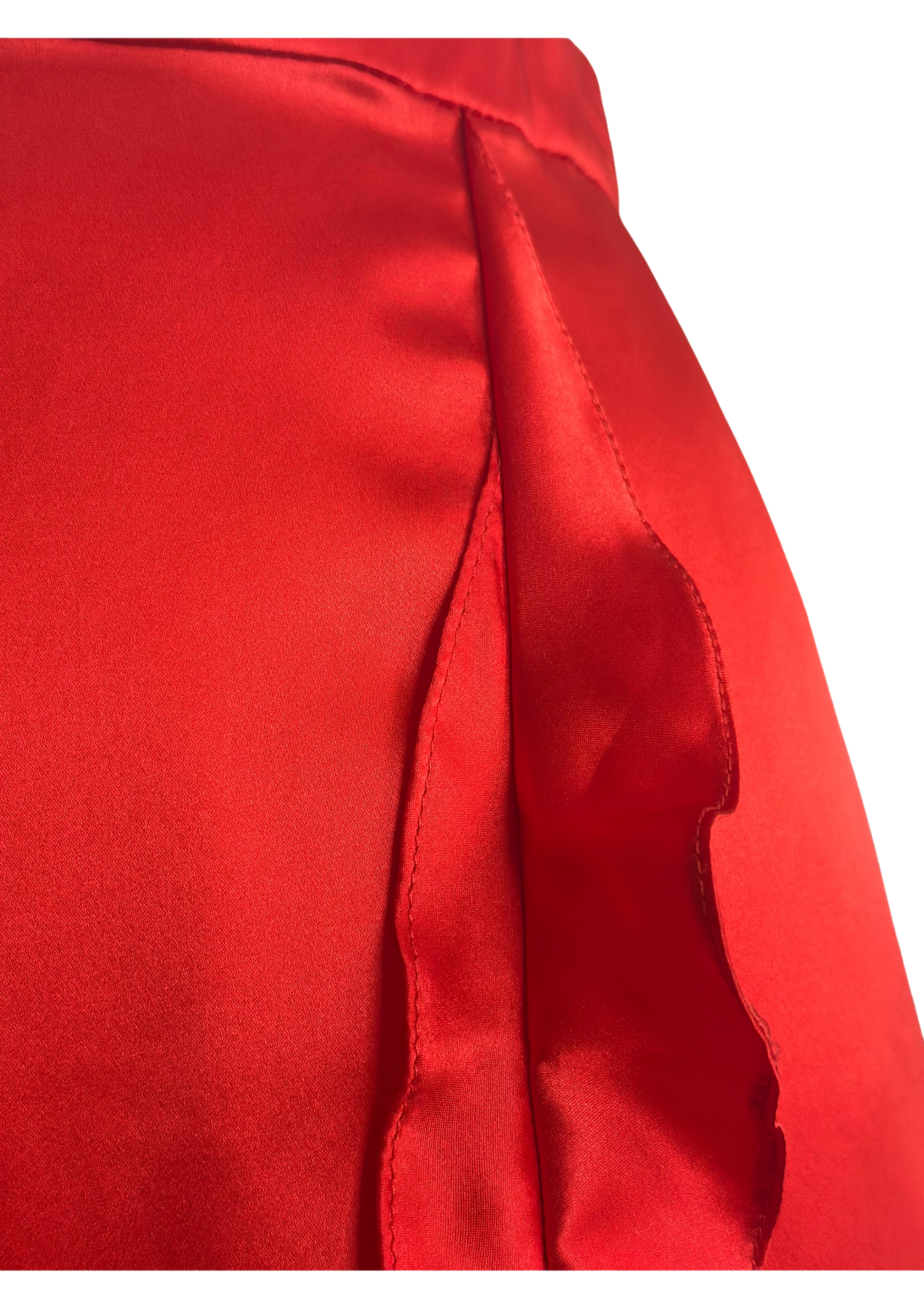 Jupe courte ajustable en Soie Italienne, doté d’une ouverture arrondie mettant en valeur le milieu de la cuisse, ce modèle est orné de deux volants qui descendent élégamment le long de la couture. Ces volants glissent sur la cuisse et s’animent subtilement à chacun de vos mouvements ou sous l’effet du vent.